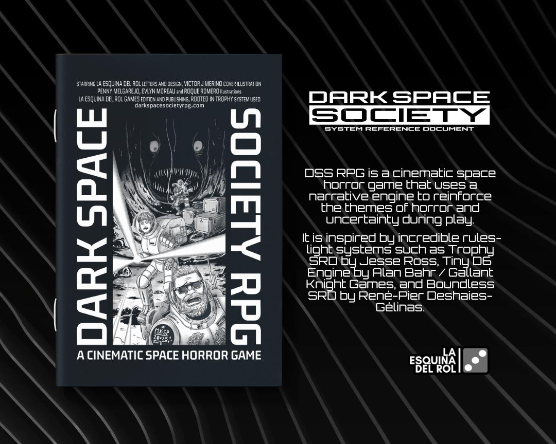 Dark Space Society RPG es un juego de horror espacial cinemático que usa un motor narrativo para involucrar a las Personas Jugadoras en temas de horror e incertidumbre durante la partida.